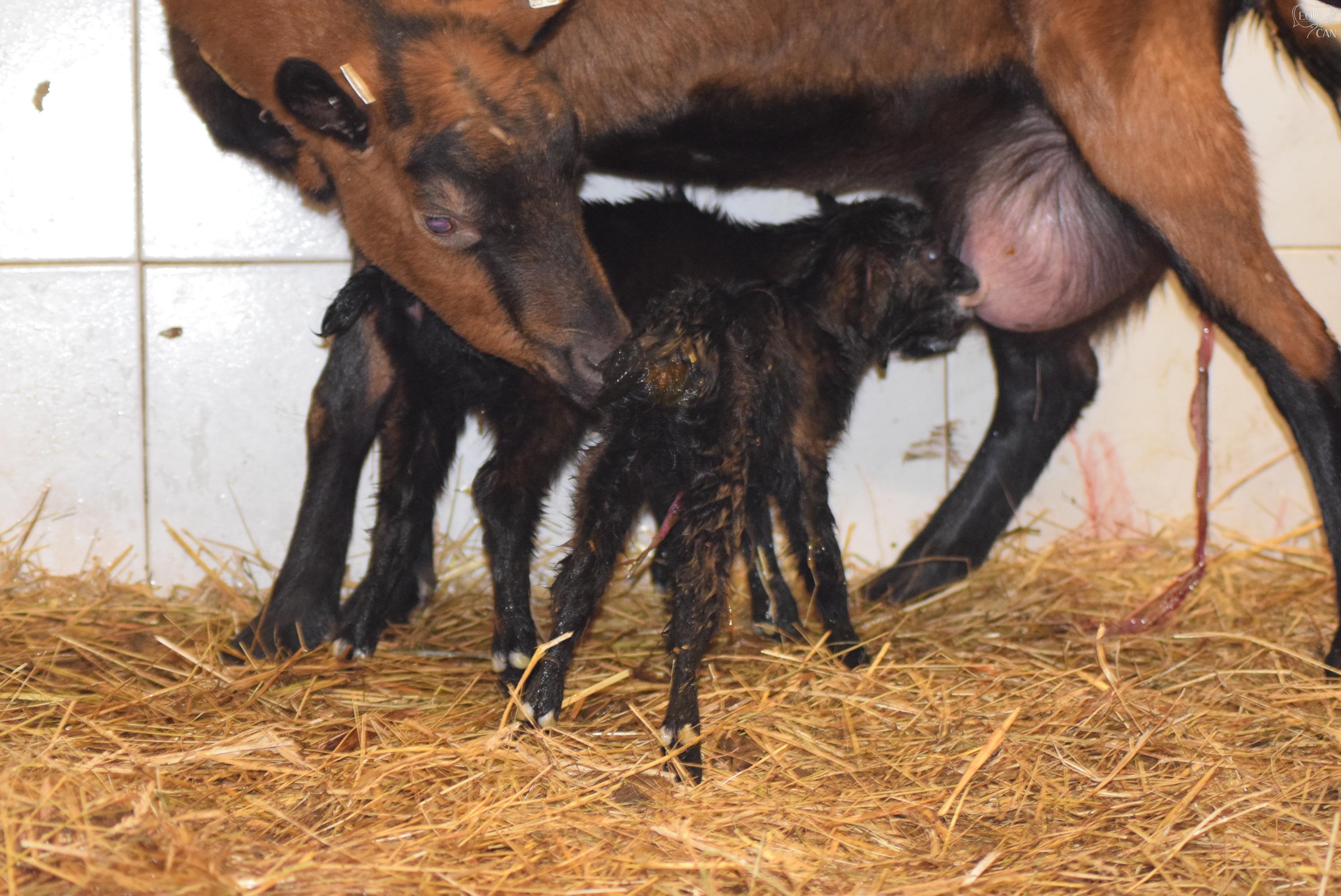 po půl hodince od porodu obě kůzlátka stojí a pijí